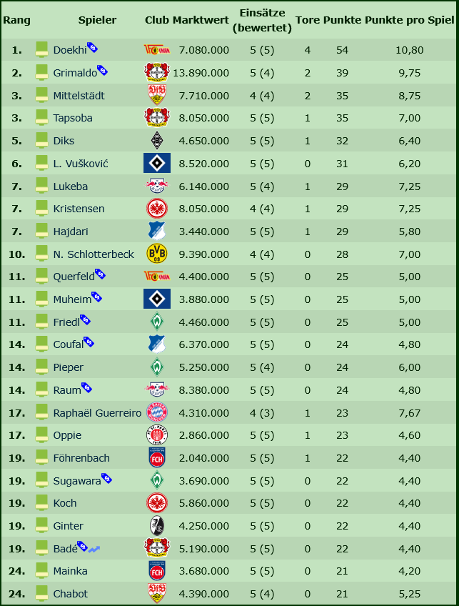 Gleich viele Punkte, aber etwas günstiger als Tapsoba: Maximilian Mittelstädt startete überragend in die neue Spielzeit und kommt insgesamt mit 7,11 sogar auf einen noch höheren Schnitt als zuletzt. Bemerkenswert: Für seine 35 Punkte benötigte der Linksverteidiger des VfB Stuttgart nur vier Partien.