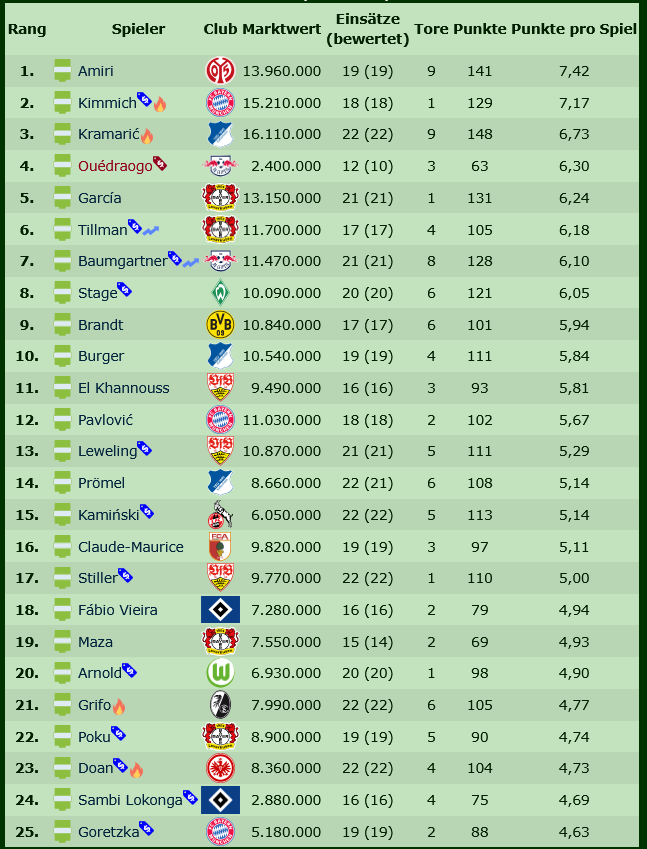 Nadiem Amiri hat sogar schon 141 Zähler auf dem Konto. Diese sind zu einem Großteil auf sieben verwandelte Elfmeter zurückzuführen. Böse Zungen würden den Sechser von Mainz 05 wohl als Profiteur der auf den VAR zurückzuführenden Strafstoß-Flut bezeichnen.