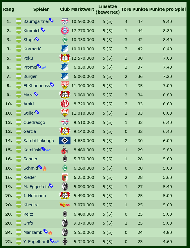 47 Zähler aus fünf Spielen macht dem 26-Jährigen zurzeit keiner nach. Über die gesamte Saison gesehen gehört Baumgartner ebenfalls zu den besten Spielern. Als nächstes trifft er mit RB Leipzig am Sonntag um 15:30 Uhr auf Werder Bremen.