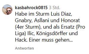 Die große Frage ist natürlich: Reicht es, wenn einer der Ersatzstürmer verkauft wird, oder muss einer der teureren weg? Luis Diaz und Fisnik Asllani wären für mich unverkäuflich, auch auf Serge Gnabry und Franck Honorat halte ich große Stücke. Der Gladbacher wird gerade wieder fit, hier habe ich Hoffnung auf starke Leistungen wie in den letzten beiden Jahren.