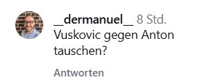 In deiner Situation dürfte es aber sinnvoller sein, auf Vuskovic zu setzen. Der Youngster ist fit und verspricht auch langfristig eher mehr als weniger Punkte als Anton. Theoretisch könnte Anton zudem im Laufe der Rückrunde auch mal rausrotiert werden, während Vuskovic beim HSV immer spielen muss, wenn er kann.