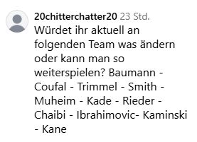 Generell würde ich sagen, dass dieses Team Veränderungen nur benötigt, wenn gute Alternativen auf dem Markt sind. Spieler wie Baumann, Coufal, Smith, Muheim, Chaibi, Kaminski und Kane sehe ich als absolutes Gerüst. Auch Trimmel und Ibrahimovic haben aktuell ein starkes Preis-Leistungs-Verhältnis.